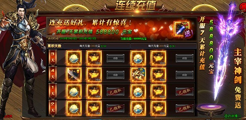 累计充值3天,每天充值1000元宝(高级转生丹*5 1000元宝),每天充值5000元宝(超级转生丹*5 3000元宝)