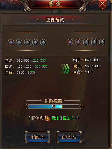 激活鉴定项可以给玩家角色带来大量的属性加成,属性加成的属性项有:物攻、魔攻、道攻、物防、魔防、生命、准确、闪避等属性,激活不同的鉴定项和进阶不同的进阶项可以带来不同的属性加成,例如鉴定百炼灯可以增加角色的物防、魔防和生命属性,鉴定唤神珠可以增加角色物攻、魔攻、道攻和暴击属性,这里小编就不一一介绍了,玩家可以自行体验。