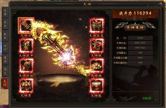 屠魔系统内新增天神装备,穿戴天神装备附加全新的天神攻击、天神防御、天神暴击等属性效果: