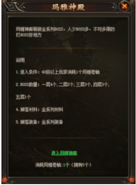 玛雅神殿一共5层,每层都有大量BOSS,击杀后可获得极品装备,是玩家行会争夺资源的首选(玛雅卷轴可在商城购买)