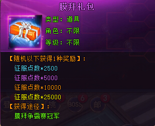 8.周一19:55至周日23:59: 59可以对冠军进行膜拜,每天可以膜拜1次,可以获得征服礼包