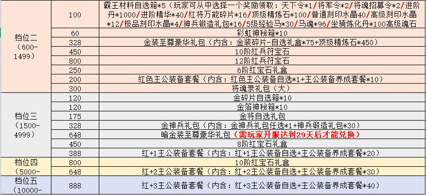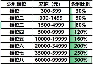 1、每个档位的返利比例不同,该返利并非是给游戏内货币,而是线下礼包的购买货币。(重点!)