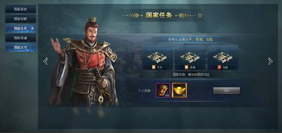 国家成员可通过共同努力,完成国家设置的各类的任务,只要任务目标达成,每位国家成员都可以领取相应的国家等级奖励。