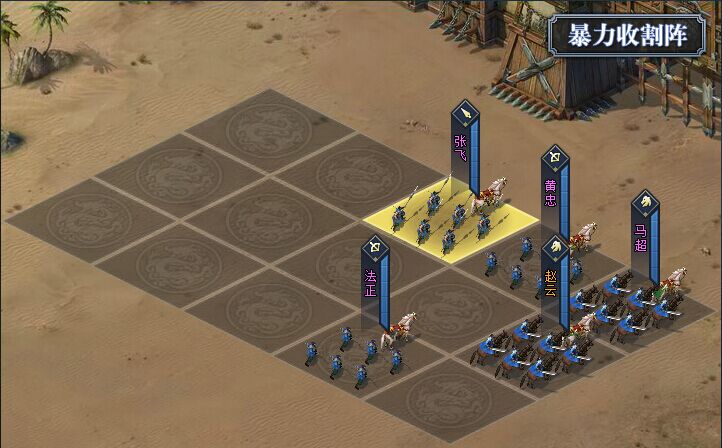 布阵思路:以近战将领保护远程将领为主,将黄忠放置于第一位,使其更早打出秒杀效果,先手使敌方减员。赵云和马超两名骑兵放置于边路同一列,保证骑兵突袭的成功率。