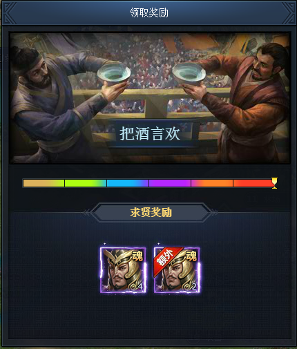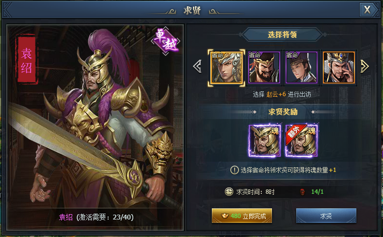 求贤开始后需要等待一定时间,期间被求贤的将领会发出求贤考验,通过考验可大幅度加速求贤进度。求贤结束后,可获得大量求贤将领对应的将魂碎片。选择与求贤将领有宿命关系的将领出访能获得更多的碎片奖励。