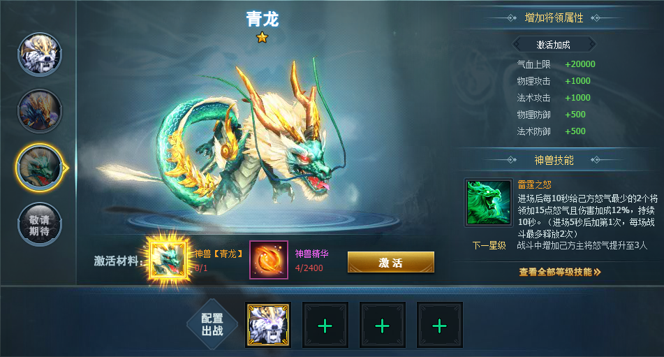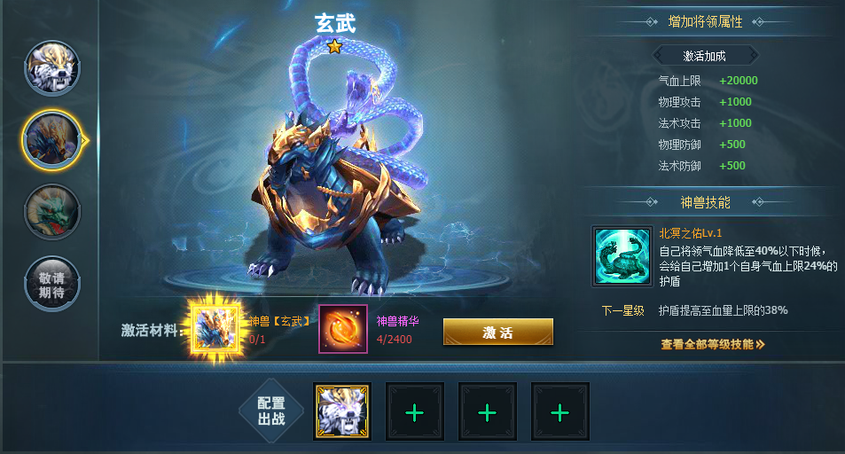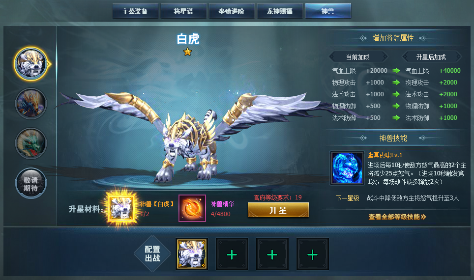 在网页游戏《三国群英传一统天下》中,官府等级达到16级且开服第15天开启【神兽】系统,目前一共有三种神兽,分别是白虎、玄武和青龙,集齐对应的神兽碎片和神兽精华便可激活神兽。这三种神兽都可以增加将领属性,不同的神兽技能也不同,随着神兽等级的提升,技能也逐渐增强,有了上古神兽的出战,它们定会在战场上各显神通歼灭敌军。下面我们来看下它们都有什么技能以及加成效果。