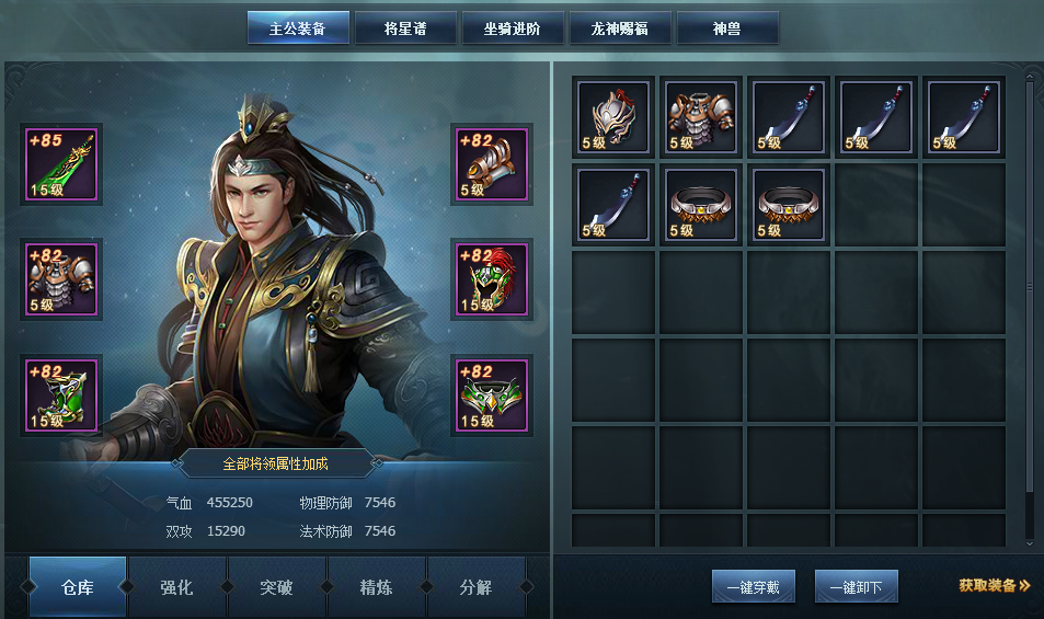 仓库用来安放主公多余的装备,主公将低级装备替换成高级装备后,装备就会落入仓库里。主公们也可以选择“一键穿戴”以及“一键卸下”来实现装备的更换与提升。