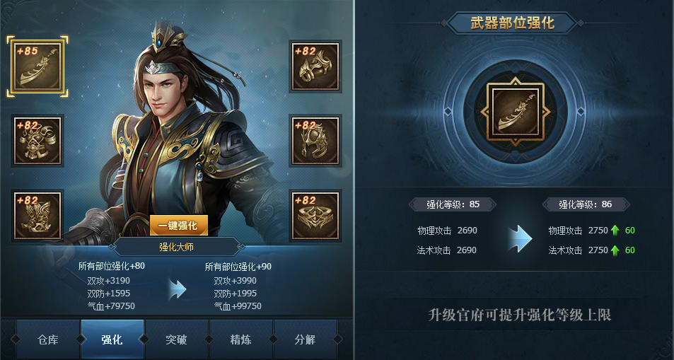 强化就是将已穿戴部位的装备进行强化,从而对角色进行提升。游戏中包含武器、护手、铠甲、头盔、鞋子、腰带六大部位,点击“一键强化”即可实现全部部位的强化,以提升双攻、双防、气血等属性的提升。提升过程中需要消耗一定数量的强化石以及铜钱。