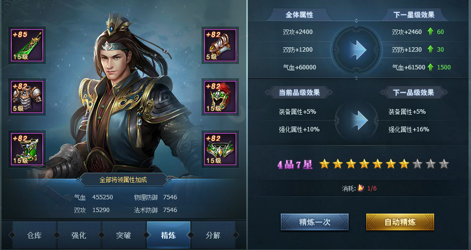 突破可以提升全部将领的属性加成,依然是可以分别提升武器、护手、铠甲、头盔、鞋子、腰带六大部位,不过普通装备无法进行突破,只有橙色装备才能突破,突破需要消耗血精石,此物品可通过参与活动获得。