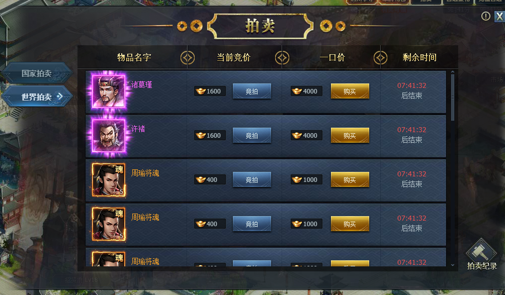 在【拍卖】系统中,左侧记录了国家拍卖以及世界拍卖的物品,一般来说当前国家若是没有东西可以卖我们就会到世界窗口淘淘宝。世界拍卖又划分为道具、将领、神纹,点击此项后玩家可以根据左侧名称找出自己需要的物品。价格分为“当前竞价”和“一口价”,当前竞价售价较低,可尝试购入,一口价的价格有时候是竞价的一倍之多,所以建议玩家尝试竞价后再购买。购买成功获得的物品会通过邮件发放给主公。