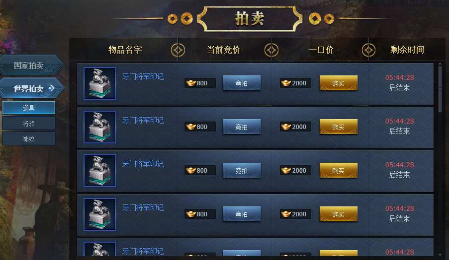 官印提升需要使用印记,在【拍卖】系统中,玩家可以使用元宝来购买各种印记。左侧记录了国家拍卖以及世界拍卖的物品,世界拍卖点击道具一项,就会展现出不同的印记,价格分为“当前竞价”和“一口价”,当前竞价售价较低,可尝试购入,一口价的价格有时候是竞价的一倍之多,所以建议玩家尝试竞价后再购买。玩家根据左侧名称找出自己需要使用的官印材料购买即可,购买后到官印系统中就可以使用了。