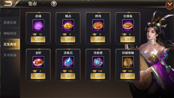玩家可以消耗元宝购买将魂、拜访礼物、洗炼道具以及回城卷轴