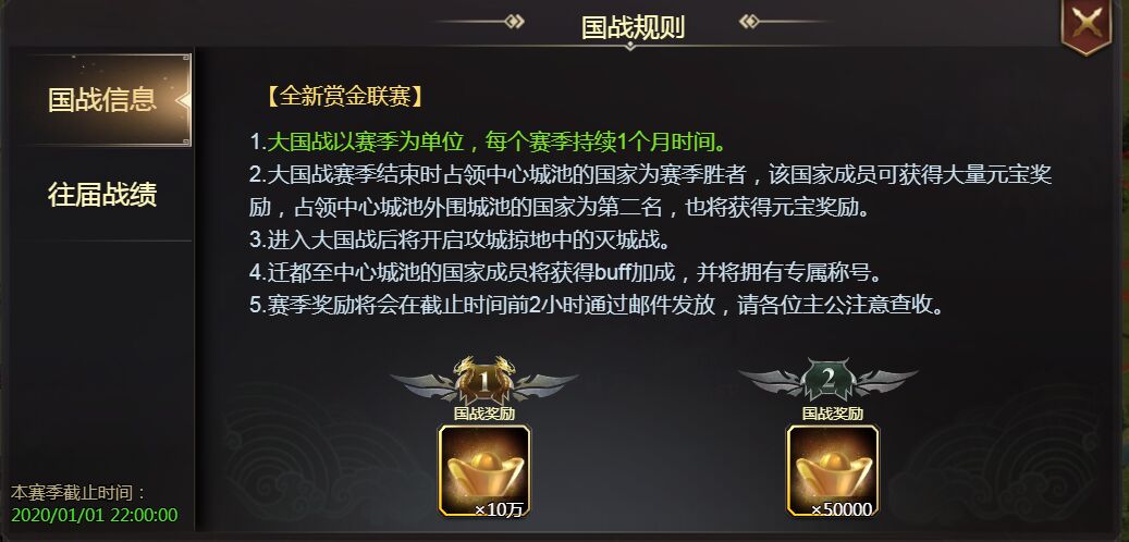2、大国战赛季结束时占领中心城池的国家为赛季胜者,该国家成员可以获得大量元宝奖励,占领中心城池外围城池的国家为第二名,也将获得元宝奖励。