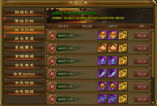开服活动内,达到一定战力可领取限量奖励。