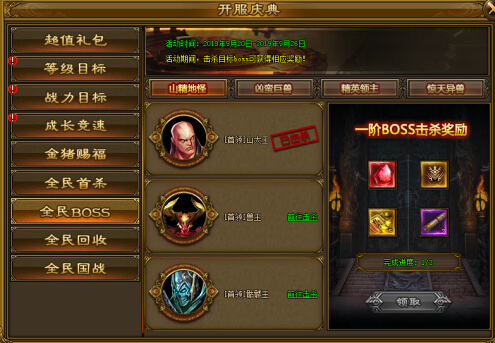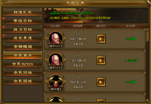 开服前7日可参与该活动,每个服务器首次击杀指定BOSS时可获得大量元宝奖励