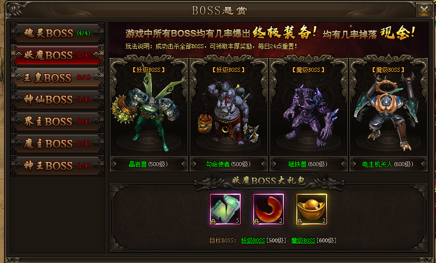 完成boss悬赏任务可以获得技能残页、血玉精华、元宝、藏宝图、灵宝精华等,每天24点将会重置任务次数和奖励,任务奖励每人每天可以领取一次,大家千万不要忘了领取奖励哦。
