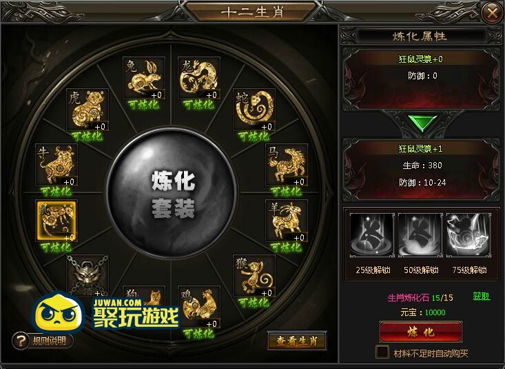 3.消耗炼化石对生肖部位进行炼化提升属性,炼化等级提升还可以解锁生肖技能
