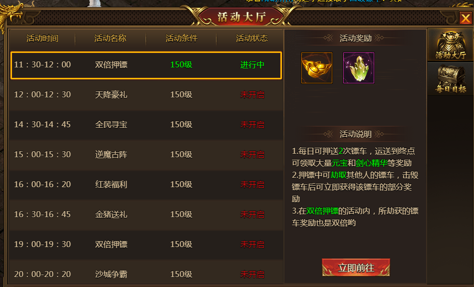 押镖活动参与需要150级,每日可以押送两次镖车,运送到终点可领取大量元宝和剑心精华等奖励