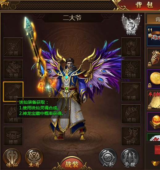 玩家要想获得各种诛仙装备,比较快捷的方法,就是直接在神龙宝藏内进行挖宝,会有一定几率挖出诛仙装备。玩家也可以收集诛仙灵魂的材料和元宝,然后进入合成系统里,可以合成各种诛仙装备。诛仙灵魂可以通过逆魔古阵来获得的,或者回收多余的诛仙装备,也能获得一些诛仙灵魂。