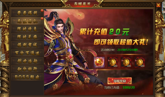 1.活动期间,玩家每日充值20、200、500元,均可领取超值大礼;