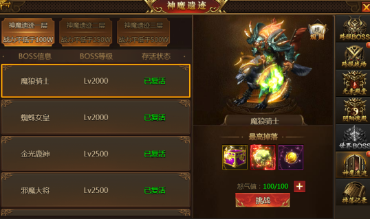 玩法说明:神魔遗迹有多层,每层都栖息着众多BOSS,玩家进入需要达到一定的战斗力条件,里面的BOSS有着非常丰厚的掉落。每天0点玩家会刷新100点怒气值,在神魔遗迹里面击杀BOSS并获得归属奖励后会扣除一定怒气值,怒气值为0时获得BOSS归属不会获得奖励。在遗迹中死亡掉落装备的概率是普通地图的一半,遇到困难可向帮派成员发起协助请求,协助者可助你抢夺BOSS归属,协助者成功帮协助发起者获得BOSS归属奖励后会获得秘法石奖励,协助可获得秘法石上限与世界BOSS协助奖励共享。