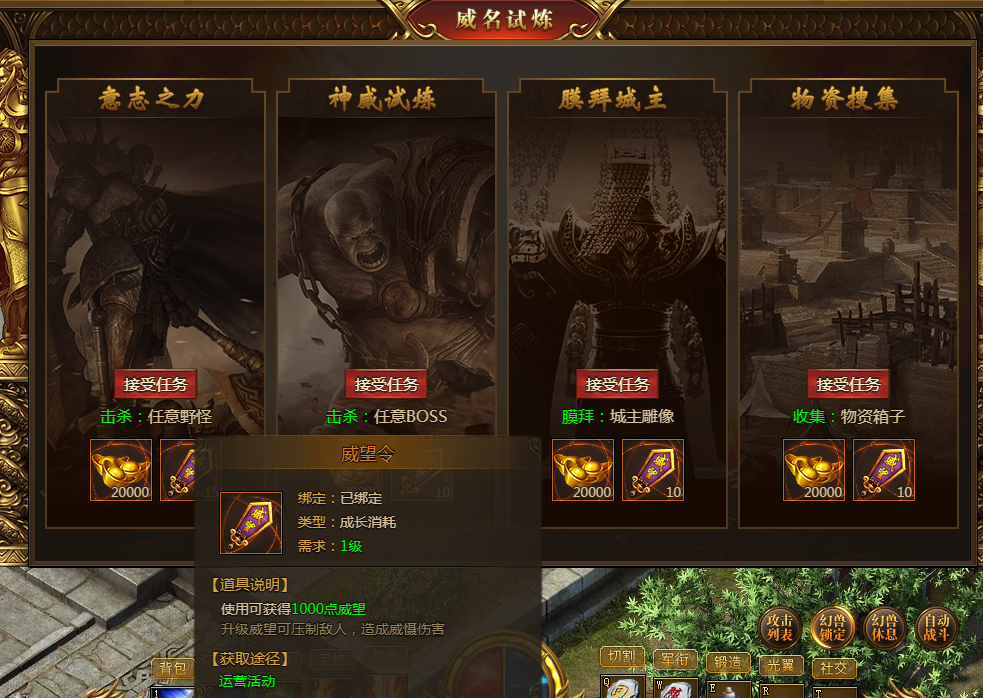 意志之力:击杀任意野怪可以完成任务,任务奖励大量元宝和威望令