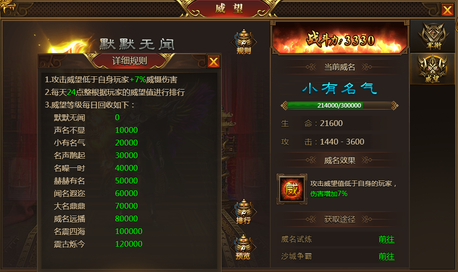 玩家在获得威名望值时会自动升级威名等级,威望值主要通过威名试炼任务获得