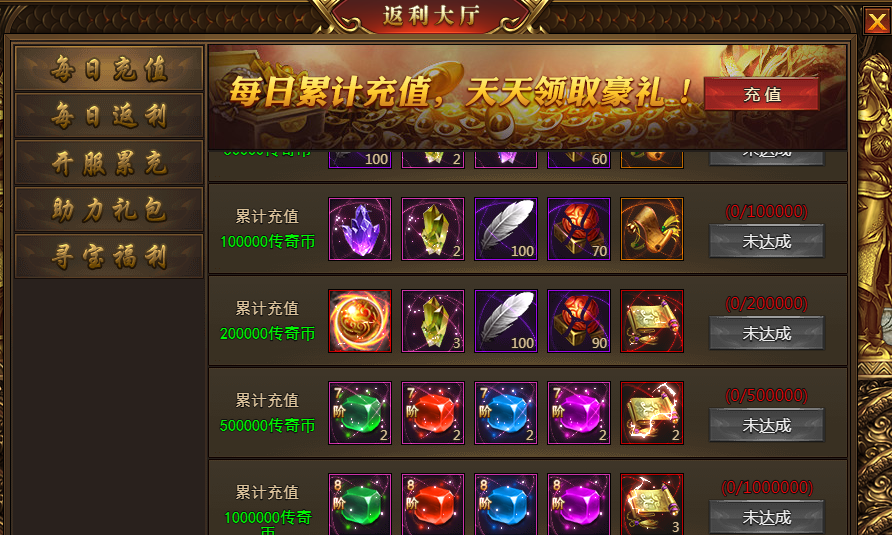 累计充值1000000传奇币:8级生命宝石、8级攻击宝石、8级防御宝石、8级坚韧宝石、创世寻龙图*3