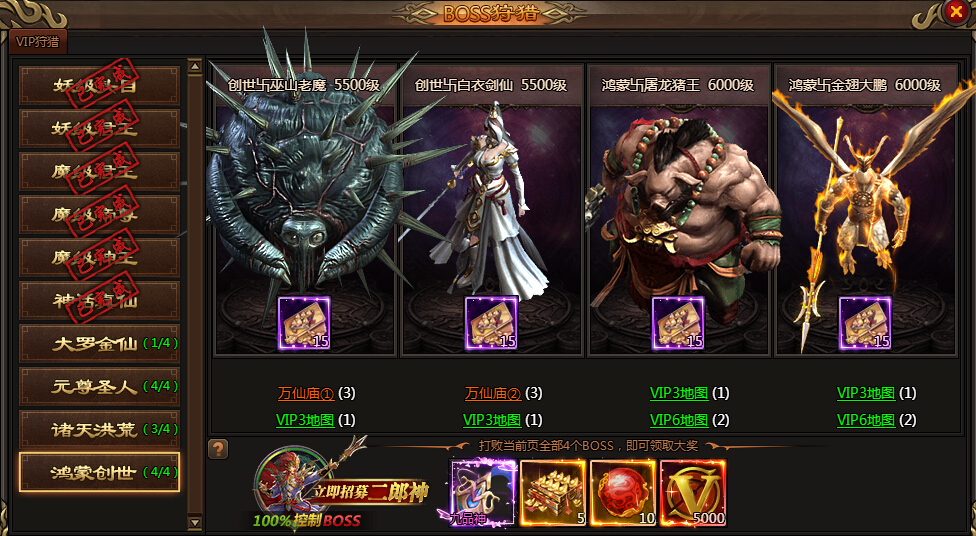 网页游戏神王中的boss狩猎,是玩家前期获取装备、神王币的重要方式,玩家击杀指定boss后可以领取奖励,打败每个页面全部4个boss,即可领取大奖。
