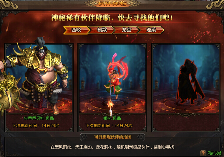 伙伴奖励中总共有4个势力的伙伴,分别为:西岐、朝歌、龙宫、蓬莱。每个势力都会有几个伙伴随机刷新在地中的任意一个位置。
