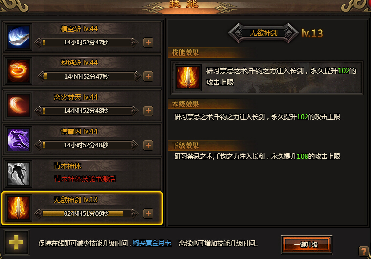 特玩网页游戏神王中的技能系统,主要可以增加玩家持续和爆发伤害,玩家保持在线即可减少技能升级时间,购买黄金月卡,离线也可增加技能时间。