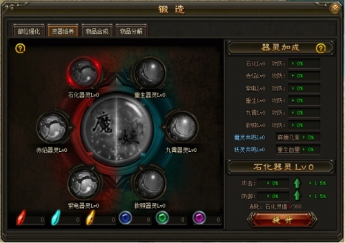 1. 升级器灵等级,可为对应的妖器提供“攻、防基础属性”加成。