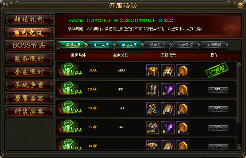 活动期间内,玩家达到指定等级可免费领取豪华大礼,数量有限,先到先得!