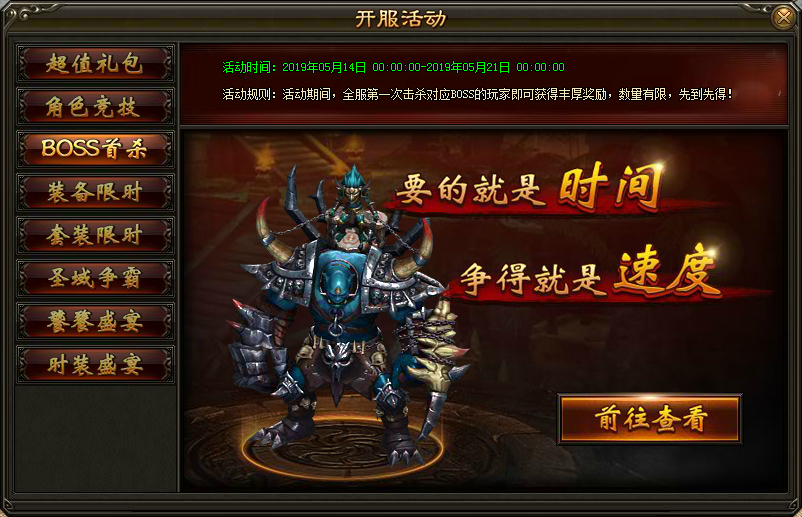 活动期间内,全服第一次击杀对应BOSS的玩家即可免费领取丰厚奖励,数量有限,先到先得!