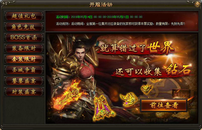 活动期间内,全服第一位集齐对应套装的玩家即可活动丰厚奖励,数量有限,先到先得!