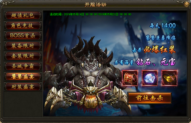 开服前七天,每天14:00饕餮巨兽降临,击杀必爆红装,另有海量钻石元宝爆出。