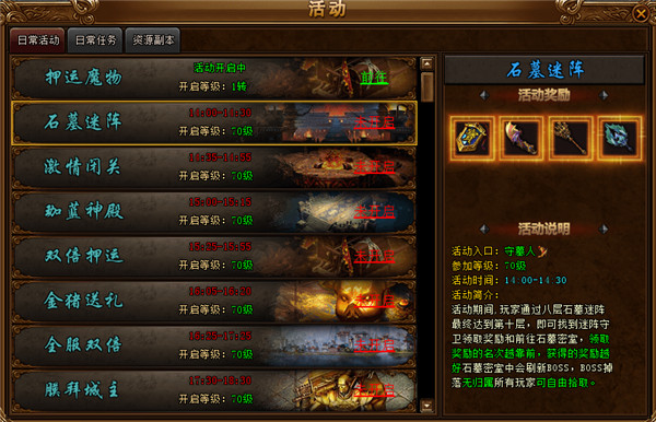 活动说明:活动期间通过九层石墓迷阵最终到达第十层,即可找到迷阵守卫领取奖励并可前往石墓密室。到达第十层的名次越靠前,获得的奖励越好。石墓密室中会刷新守墓BOSS,击杀BOSS可掉落无归属的高级装备奖励,所有人可自由拾取。