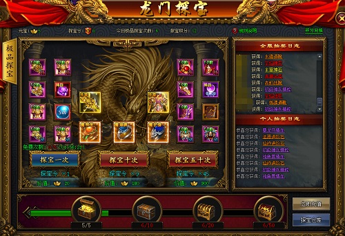 龙门探宝每次在探宝时都需要花费探宝令,每次探宝都可以获得1个探宝积分,当玩家使用绑定的探宝令进行极品探宝时必定会获得绑定物品,探宝获得的物品将会存放在探宝仓库,玩家需要进行提取才会到玩家的背包中。