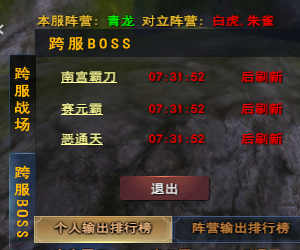 跨服战场氛围3大阵营:青龙、白虎、朱雀,所以玩家需要把握好时间进入跨服战场,迟了就有boss就可能会被其它玩家击杀了。更多精彩内容,可进入武林三官网查看:http://www.tewan.com/wulin/