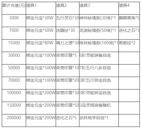 备注:当日累计取最高档发放,只发放一档奖励,道具隔天申请,如玩家5号充值10000,可以申请10000档位道具,不能同时申请5000。