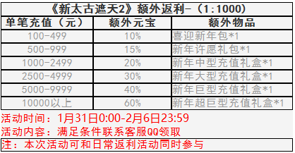 活动期间内(2月1日当天)充值指定金额:500元的大侠都能获得额外双倍元宝(每个账号仅限一次,联系客服领取)。