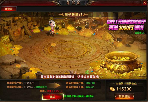 《修仙记》中聚宝盆每时每刻都能帮助玩家赚到钱,激活可爱的生财童子,获取收益的速度会加快,最多可以激活10个生财童子哦!如果聚宝盆还不够,那么你还可以通过点金术把绑元变成铜钱。 修仙记聚宝盆