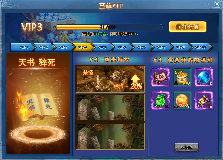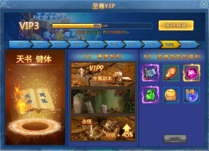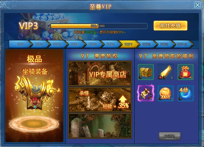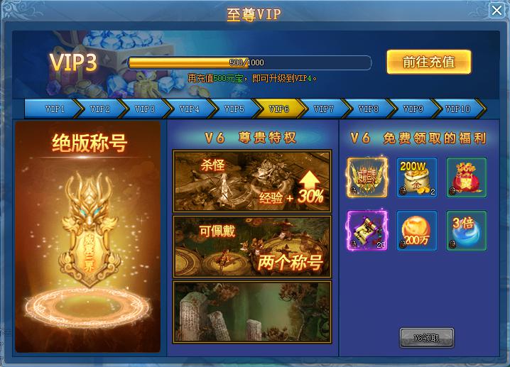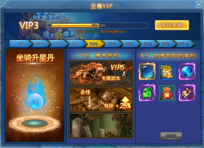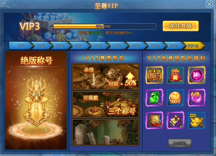 2、游戏内充值10元宝、200元宝、500元宝、1000元宝、2000元宝、5000元宝、10000元宝、20000元宝、30000元宝、50000元宝分别对应激活VIP1-VIP10。