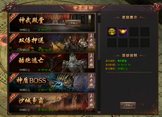 活动时间:每周一、三、五、日 18:00-18:20 进入条件:战士360级 活动开启后,进入地图的所有玩家均可以获得神武值泡点奖励。特定区域能够蝴蝶2倍,3倍甚至4倍的泡点奖励。可站橙色光圈内获得2倍奖励。站在随机绿色光圈内可以获得3倍奖励。