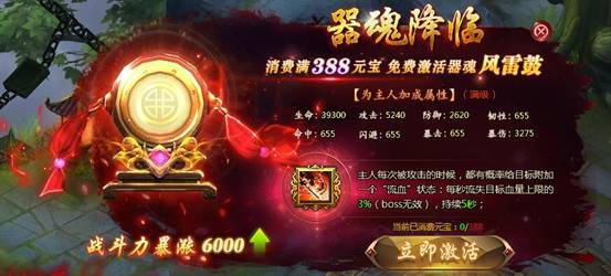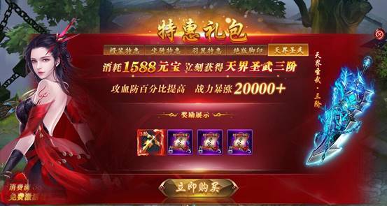 花费1588元宝可获得“三阶·天界圣武”,全民提升人物攻防血属性。