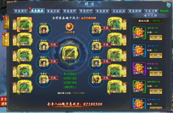 Ø 铸造-合成分解界面中可将多余的魂卡分解成仙魂以及魂卡经验,升级魂卡的历史经验将全额返还