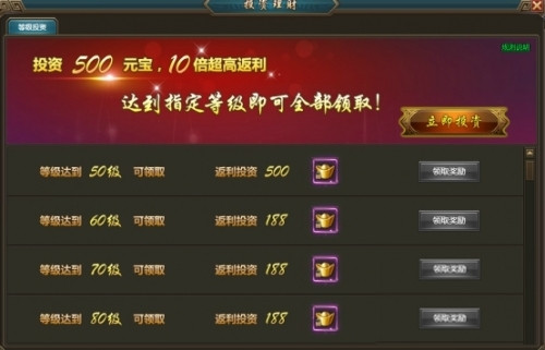 玩家进行投资后,达到指定等级即可领取返利的绑定元宝,未领取的奖励将会通过邮件发送给玩家。