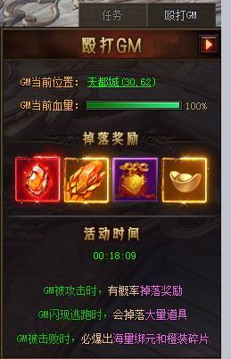 殴打GM活动是阴阳道的特色活动之一,每天天都城中都会刷新数只GM提供给玩家挑战,GM携带着大量的材料奖励和永久坐骑时装、玩家击杀后即可通过抽奖获得
