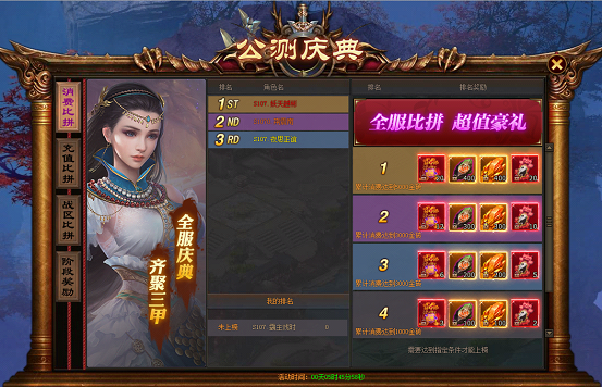 国庆期间玩家充值一定的金砖就可以进入全服排名,达到一定的排名即可以各种极品道具奖励!!!!
