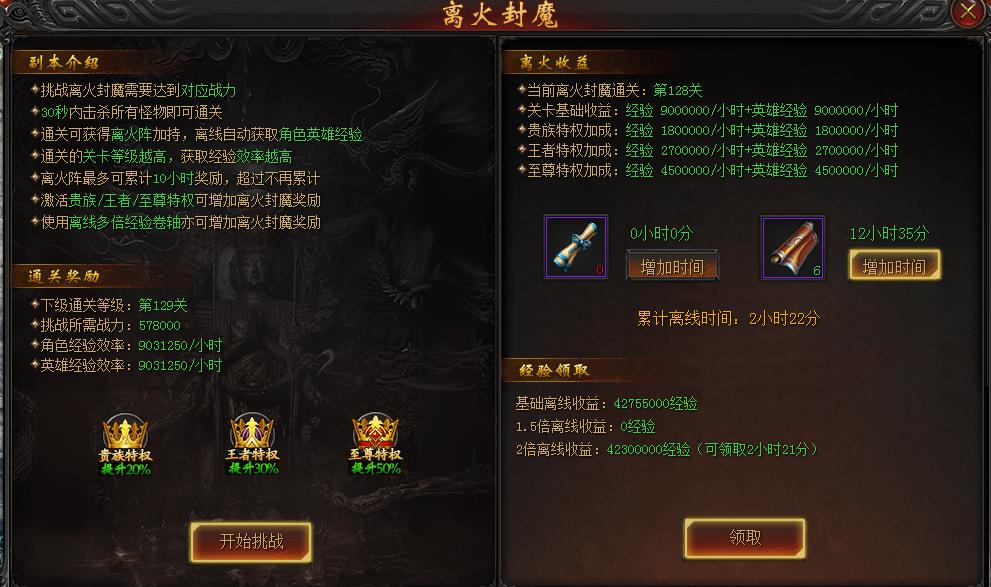 开通特权以及使用离火多倍卷轴可增加离线经验收益。